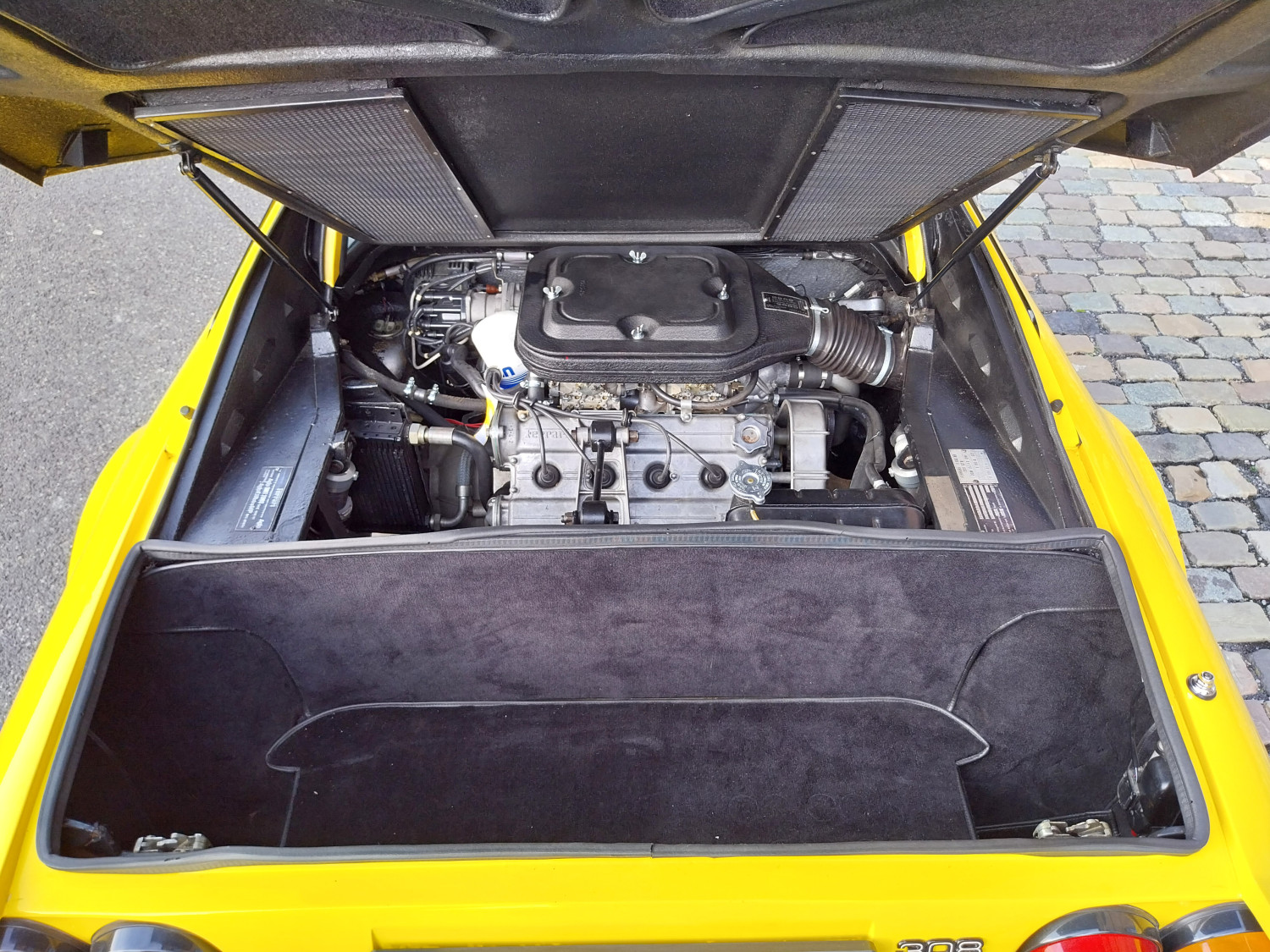 Dieser, hier angebotene 308 GTB, in seltenem, wie ikonischem ‚Modena Giallo‘, wurde zunächst nach Östereich ausgeliefert bevor er seinen Weg in die Hände von Mitgliedern des niederländischen Ferrari Clubs in Holland fand. 2016 kam er nach Deutschland, wurde regelmäßig gefahren und im Frühjahr 2025 einer Generalüberholung mit Zahnriemenwechsel unterzogen. Bei dieser wurde auch der defekte Originalmotor durch einen instandgesetzten GTS Motor (ohne Trockensumpfschmierung) ausgetauscht. Nun präsentiert er sich mit 4 Doppel-Weber-Vergasern und einem super Sound durch ein Edelstahl-Sport-Auspuff-System.