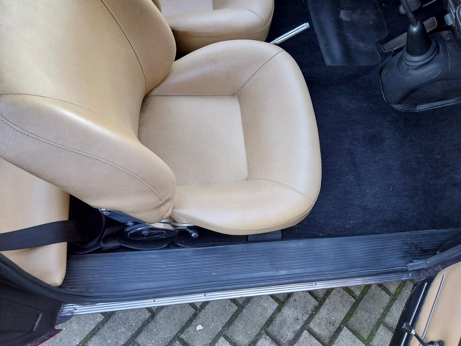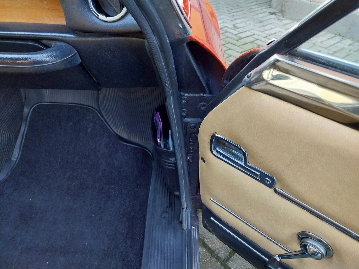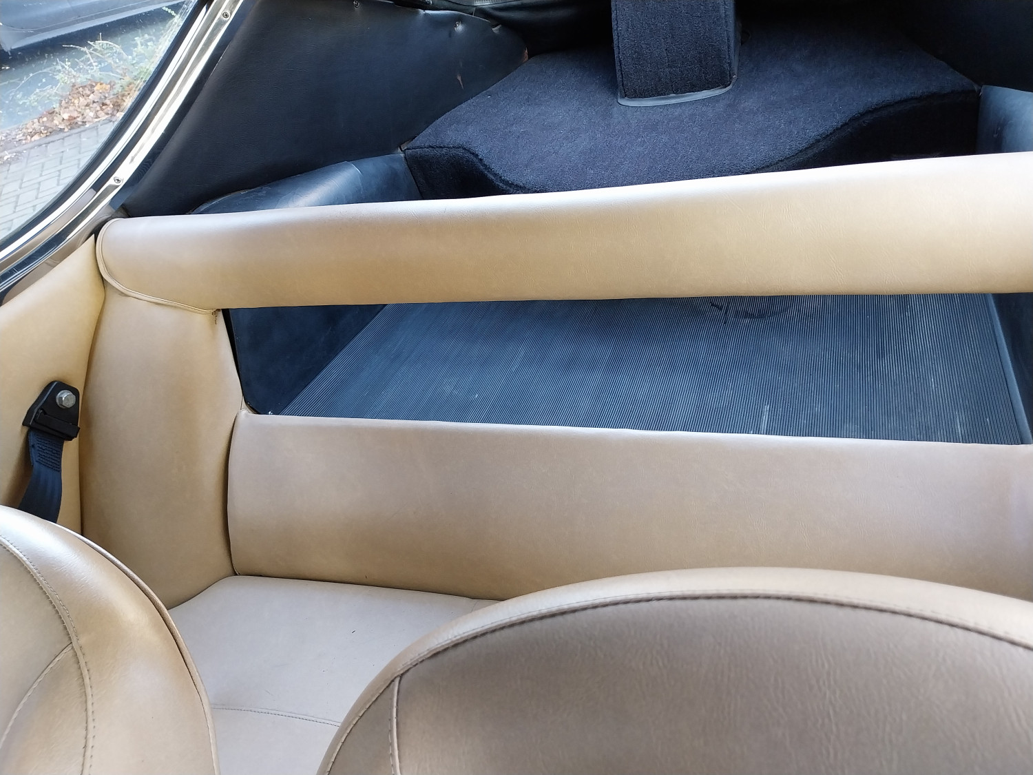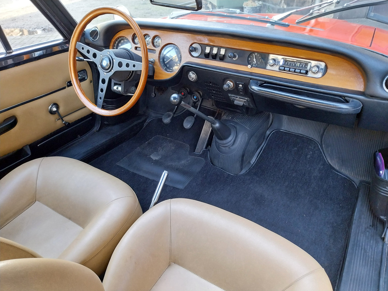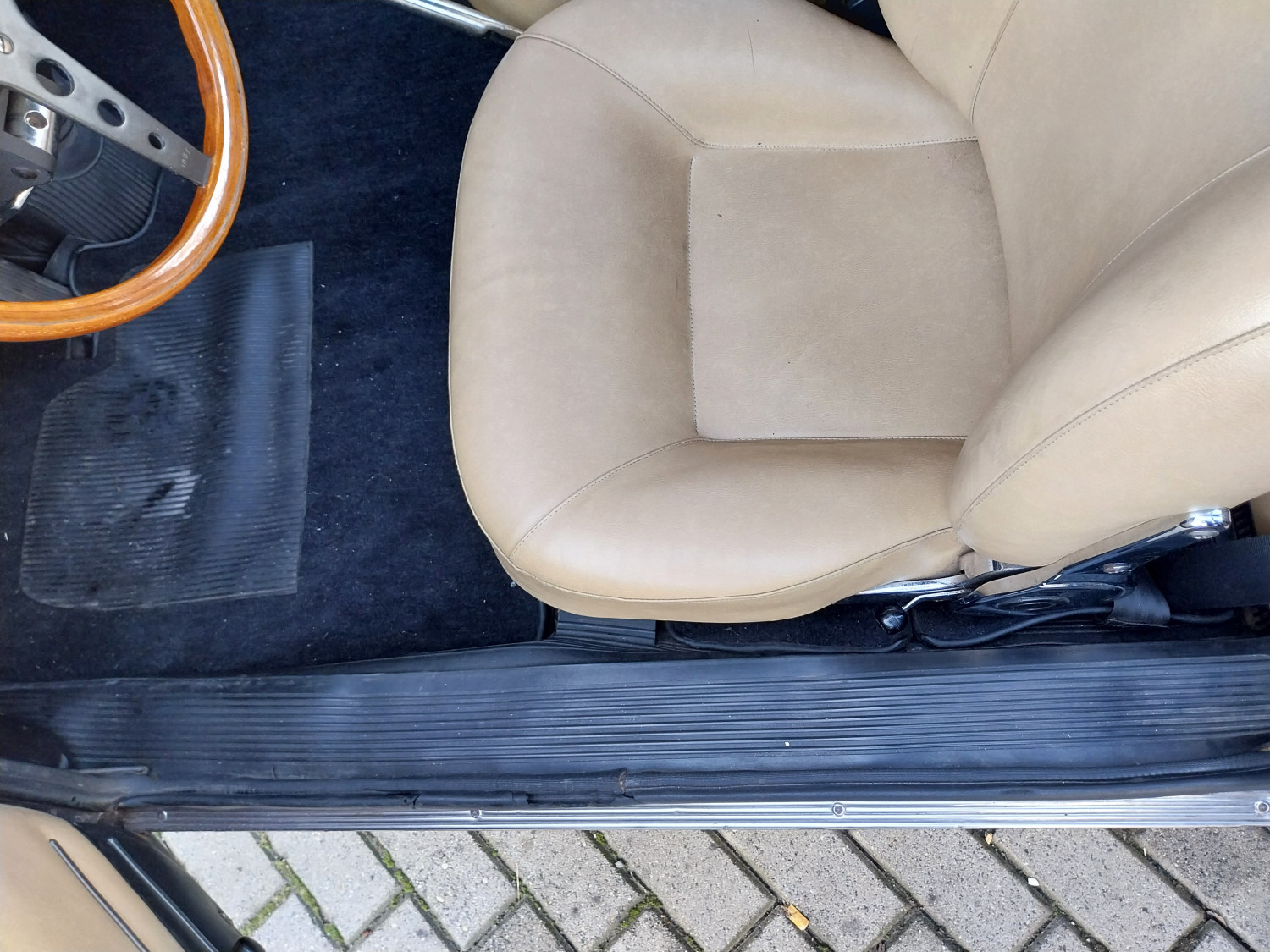 Die Innenausstattung lässt kaum Wünsche offen. Die Sitze aus beigem Kunstleder sorgen für ein perfektes Fahrgefühl und befinden sich ebenfalls in einem sehr guten Zustand. Das elegante Armaturenbrett und das Lenkrad sind aus Holz. Ihre Gebrauchsspuren erzählen auf charmante Weise von vergangenen Zeiten. Die Türöffner sind nur eine von vielen Besonderheiten dieses außergewöhnlichen Fahrzeugs.