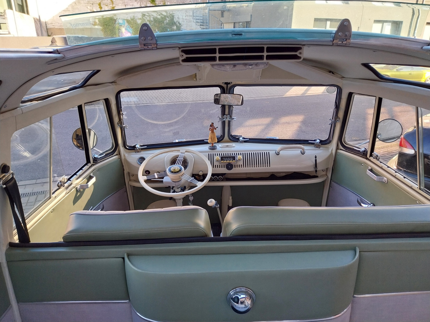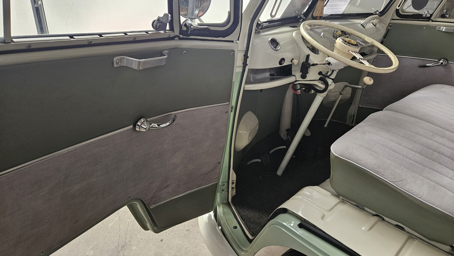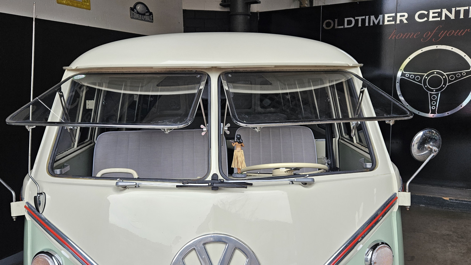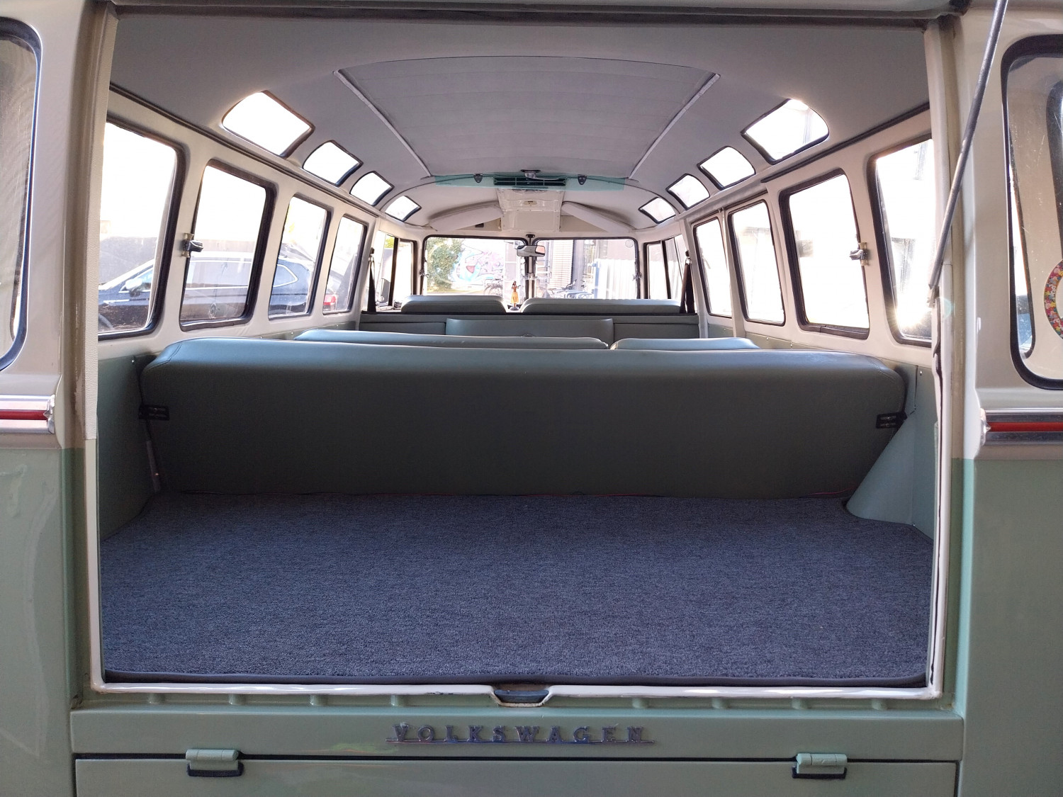 Dieses begehrte Sammlerobjekt glänzt mit seinen 23 Fenstern, die eine Rundumsicht ermöglichen sowie seiner harmonischen zweifarbigen Lackierung und der Safari-Frontscheibe, die sich komplett öffnen lässt. Der Innenraum ist mit drei Sitzreihen und 9 Sitzplätzen sehr geräumig ausgestattet.