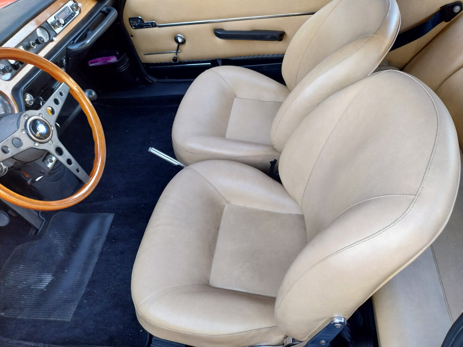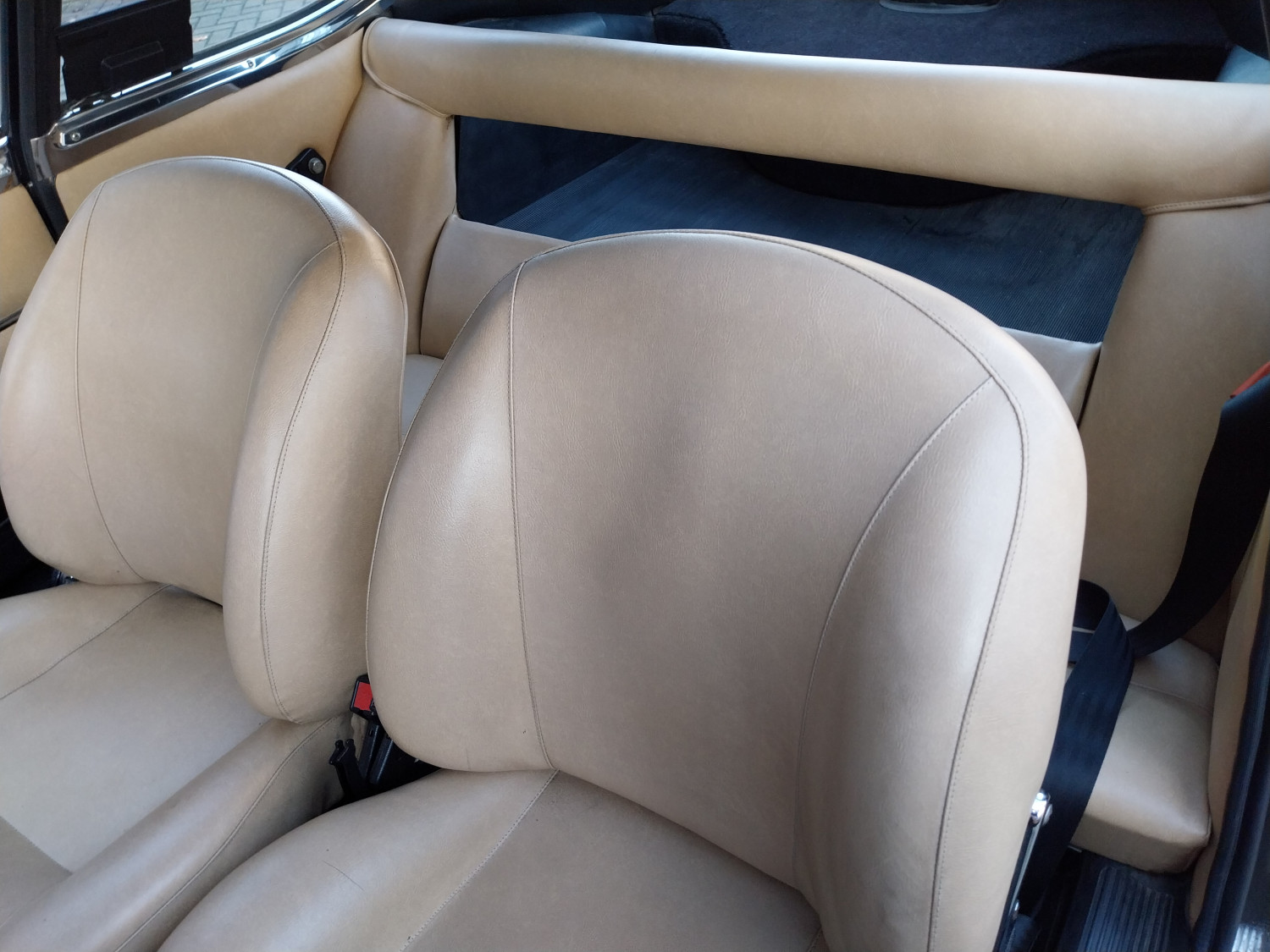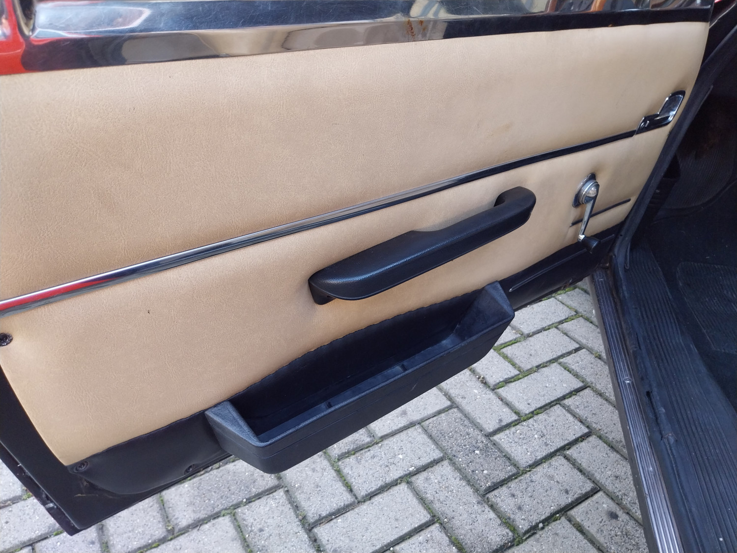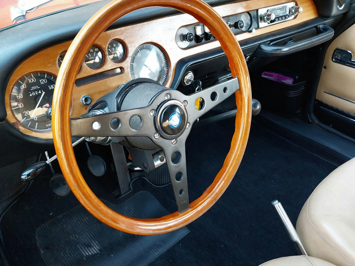 Die Innenausstattung lässt kaum Wünsche offen. Die Sitze aus beigem Kunstleder sorgen für ein perfektes Fahrgefühl und befinden sich ebenfalls in einem sehr guten Zustand. Das elegante Armaturenbrett und das Lenkrad sind aus Holz. Ihre Gebrauchsspuren erzählen auf charmante Weise von vergangenen Zeiten. Die Türöffner sind nur eine von vielen Besonderheiten dieses außergewöhnlichen Fahrzeugs.